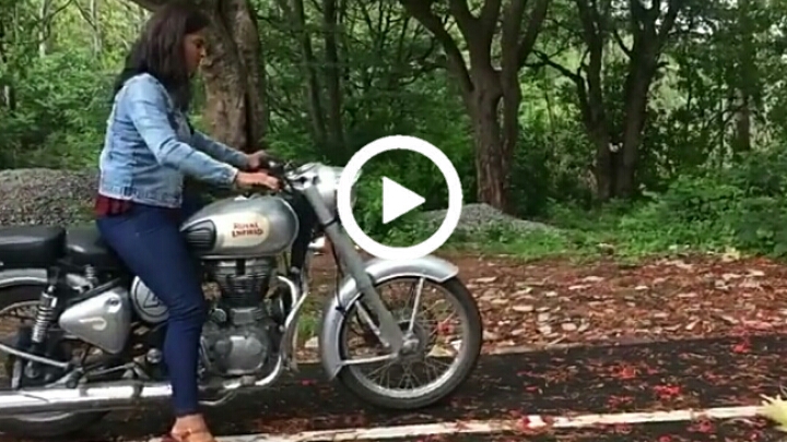 అప్పుడు మేఘావృతమైన రోజు అలాగే రోడ్లు తడిగా ఉన్నాయి. అప్పుడు నా దగ్గరకు ఒక అతను వచ్చి మీకు బైక్ నడపడం ఎలాగో తెలుసా అని అడుగారు నా సమాధానం సూటిగా చెప్పా రాదు అని కానీ తెలుసు అని, నేను అతనితో చెప్పాను. నేను 8 సంవత్సరాల వయస్సులో నేర్చుకున్న గేర్ షిఫ్ట్ ఎలా పనిచేస్తుందో ద్విచక్ర వాహనాన్ని ఎలా బ్యాలెన్స్ చెయ్యాలో దైర్యం చేసి బైక్‌ను తీసుకున్నాను. నేను పెద్ద అయ్యాక బైక్ నడపడం మొదటిసారి ఇది చాలా కష్టమని నేను అనుకోలేదు. నేను పడ్డాక అది కష్టం అని తెలిసింది, ఈ సంఘటన అప్పుడు జరిగింది. ప్రశాంత్ నా సహాయకుడు అప్పుడు రికార్డింగ్ చేస్తున్నాడు. నేను పడిపొయినప్పుడు ఎవ్వరూ నవ్వలేదు. నేను పడిపోయినప్పుడు అందరూ నాకు సహాయం చేయడానికి పరుగెత్తారు, కాని బైక్ గీతలు పడటం గురించి అందరూ ఆందోళన చెందారు. రాయల్ ఎన్‌ఫీల్డ్స్ కదా కొంత ఆందోళన ఉంటుందని నవ్వుతూ ఈ పోస్ట్ పెట్టారు.