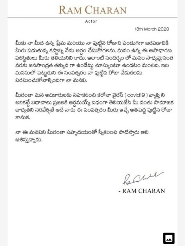 అయితే, బాధ్యతాయుతమైన పౌరుడిగా, రామ్ చరణ్ ఒక పబ్లిక్ నోట్ విడుదల చేసి, తన పుట్టినరోజును ఈసారి జరుపుకోవద్దని అభిమానులను కోరారు. చరణ్ తన అభిమానులను అప్రమత్తంగా ఉండాలని మరియు పెద్ద బహిరంగ సభలను ఏర్పాటు చేయకుండా మరియు సురక్షితంగా ఉండడం ద్వారా వైరస్ వ్యాప్తిని నివారించడంలో అధికారులకు సహాయం చేయాలని అభ్యర్థించారు.